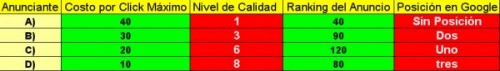 El anunciante “D” obtiene la tercera posición con un menor costo por click, y personalmente, creo que es el que gana, pagara sólo un tercio de lo que ofrece “B” y la mitad que “C” y estará junto a sus competidores pagando mucho menos, por el simple hecho de que ha realizado una correcta campaña, por eso Google le ha dado un Nivel de Calidad 8, lo cual determina que tenga un ranking del anuncio alto, aunque su ofrecimiento de CPC sea bajo.